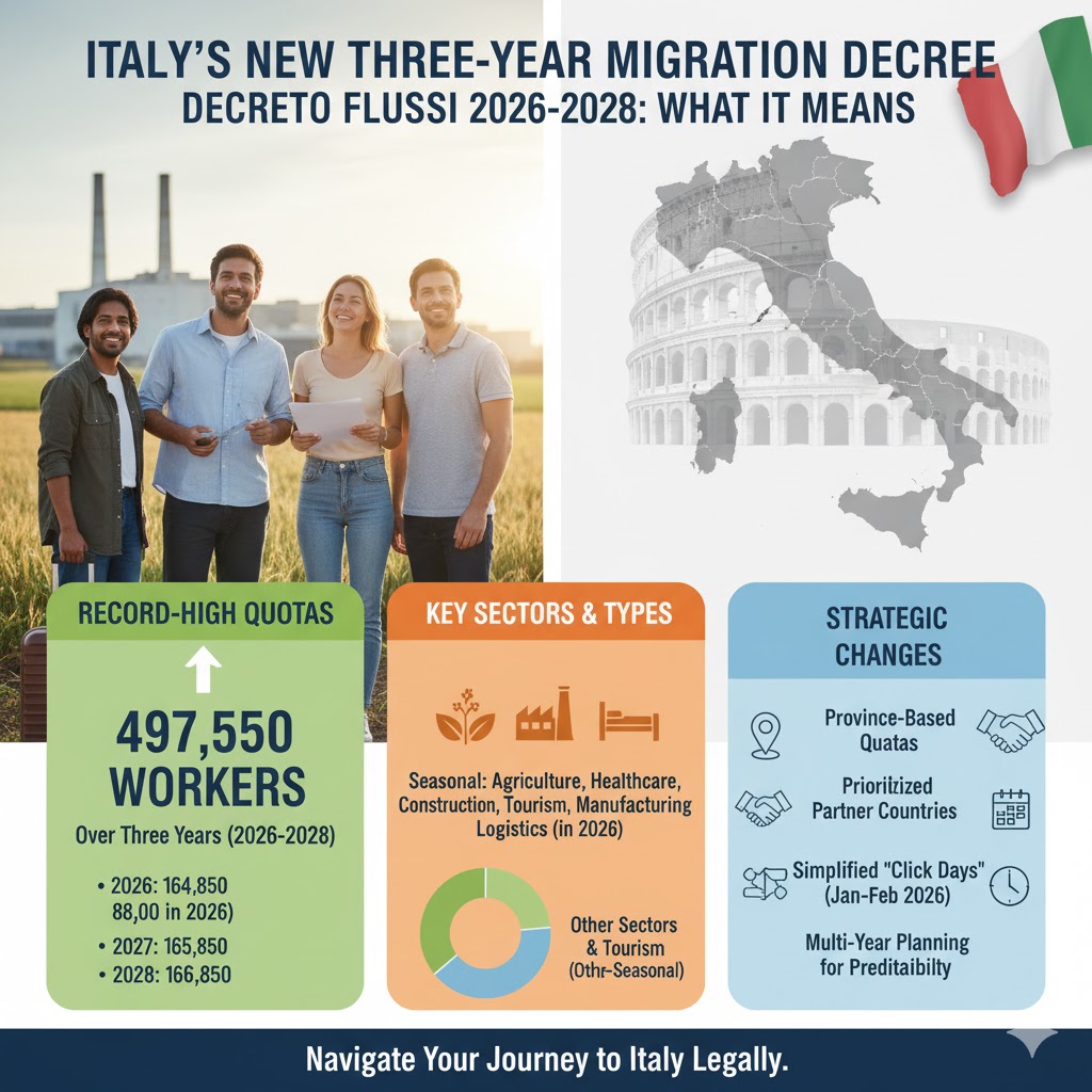 Italy is shifting to a predictable, three-year migration strategy via the Decreto Flussi 2026-2028 (497,550 quotas).
