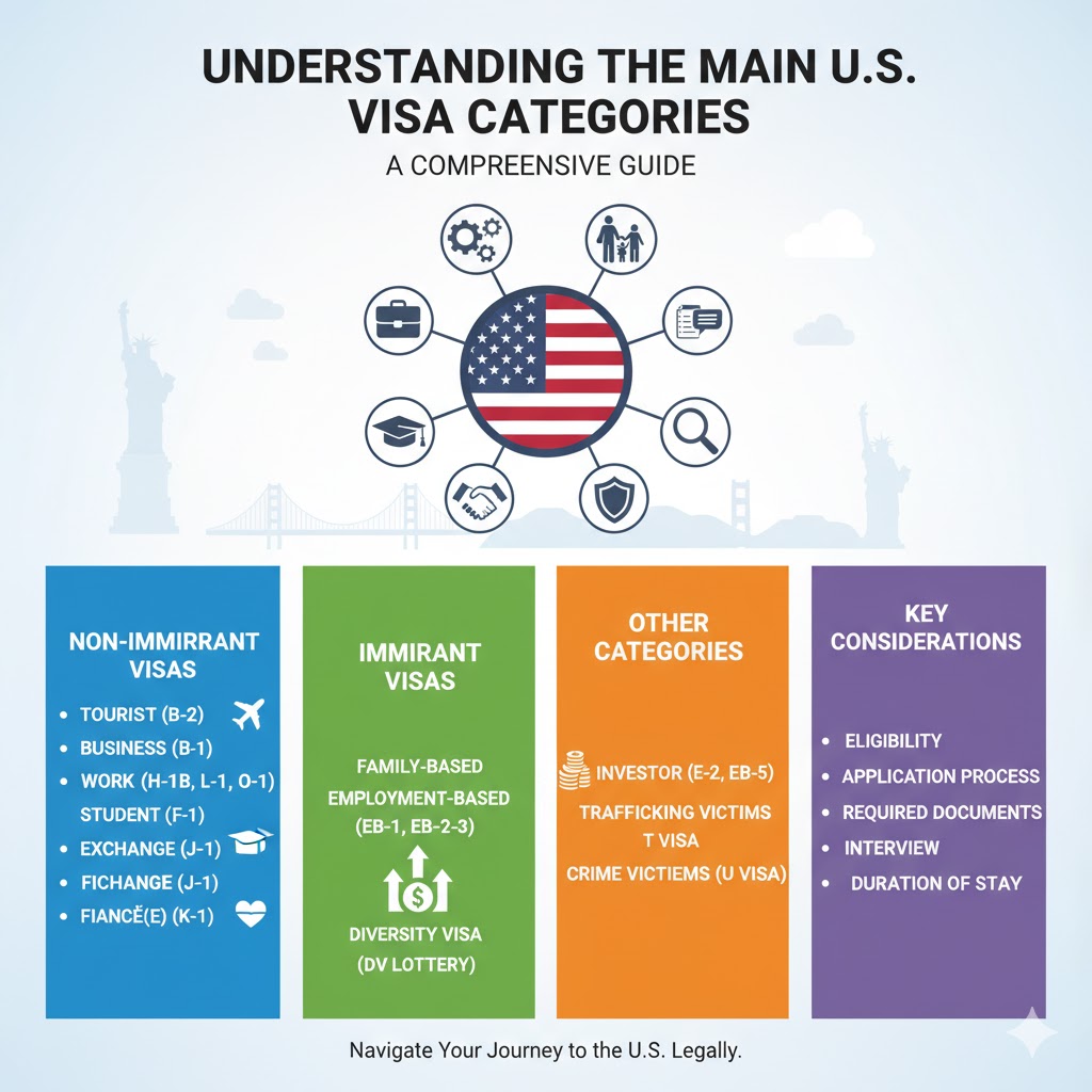 When you’re planning to travel, work, study, or live in the United States, one of the first questions is: Which visa category do I need? The U.S. issues a wide variety of visas, each tied to a specific purpose and set of requirements. According to the official U.S. Department of State (DOS), all visas fall into two broad categories — nonimmigrant (temporary) and immigrant (permanent) — and the specific visa type depends on your purpose of travel. Travel+2Travel+2